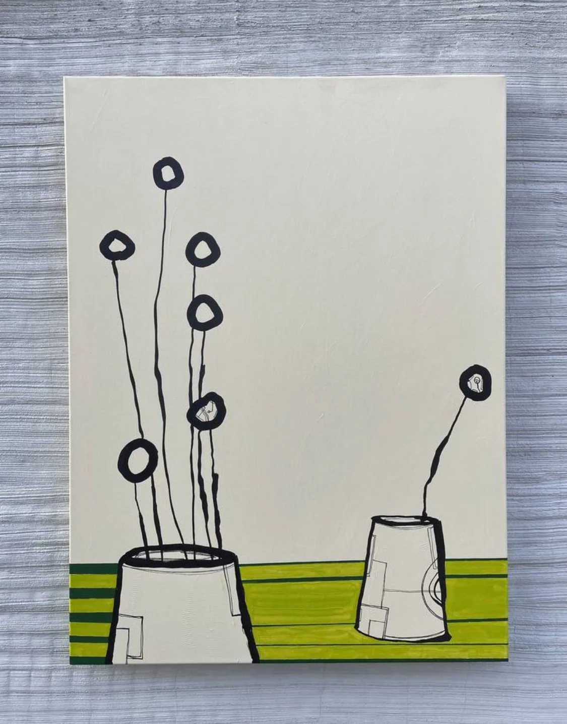 These works are marked with objects and flowers, music and family, failure and hope. The obsession with flowers continues to evolve. I hope to not only share wild colours and wisdom but to also engage the viewers to ponder, share and make space for hope.